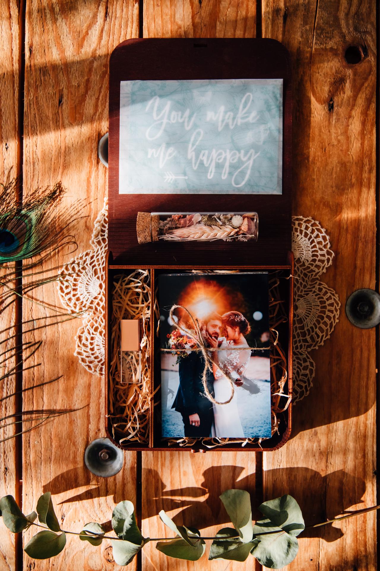 Chaque reportage mariage vous sera livré sur Clé USB dans un packaging en bois fabriqué artisanalement en Europe contenant :
