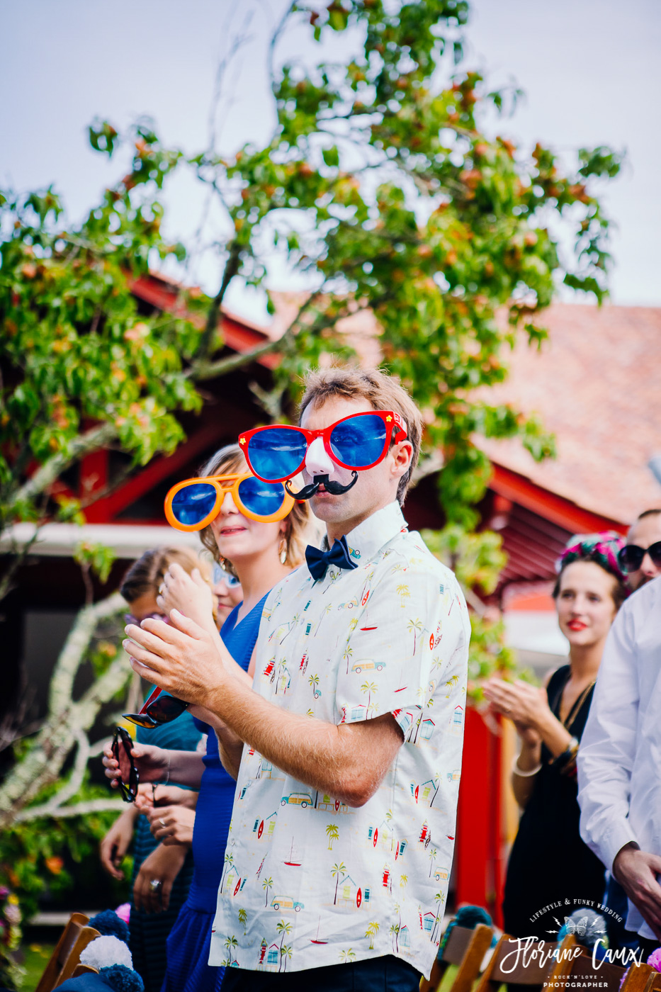 Fleuriste : Laetitia de KIMUA. Je lui avais donné carte blanche, une confiance absolue, je lui avais simplement montré mes spartiates à pompons en lui disant que je voulais de la couleur et pour mes couronnes, « sobre » pour la mairie et en forme de diadème flashy pour la cérémonie. J’ai découvert ses créations la veille pour les tables et le jour J pour mon bouquet, couronnes, ancres marines… bref mission 100% réussie
