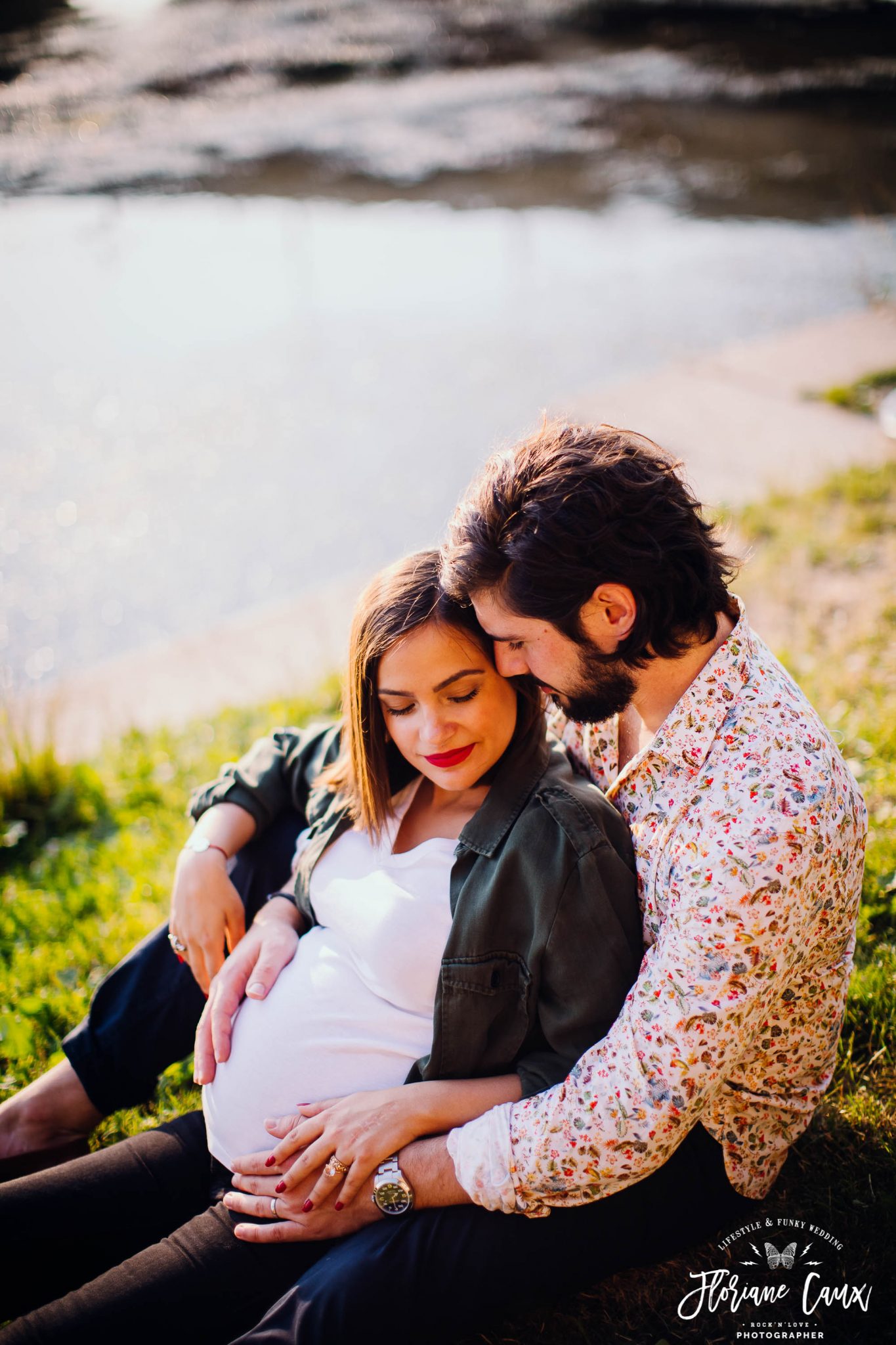 Elle m’avait déjà contactée pour réaliser ses photos de mariage l’année précédente, mais n’étant pas disponible, elle s’était dit qu’elle prendrait sa revanche lorsqu’un nouvel événement aussi joli viendrait dans leur vie. C’était sans compter que cet heureux événement arriverait en même temps que le mien… avec un terme quasi identique !! Je n’ai pas hésité une seconde, quitte à marcher pendant 2h avec mon gros ventre de 7 mois et mon matos sur le dos, autant que ce soit pour eux ! Cela me paraissait tellement important de faire cette séance, d’immortaliser leurs souvenirs de ce moment si fort… Immortaliser les prémices d’une vie, quand soi-même on a un bébé en cours de fabrication, c’est assez indescriptible.